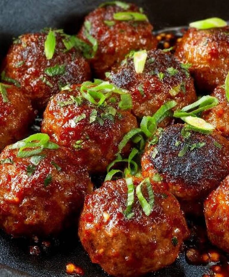 6. Step 6: Transfer the Honey Sriracha Glazed Meatballs to a serving dish. Garnish with a sprinkle of sesame seeds and freshly chopped green onions before serving hot as a delightful appetizer.