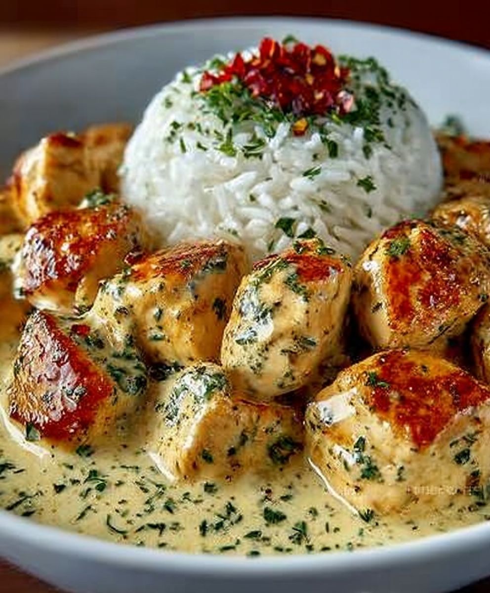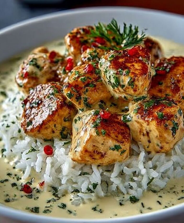 5. Step 5: Serve immediately. Serve the creamy chicken generously over portions of the comforting rice. Garnish with fresh parsley if desired.
