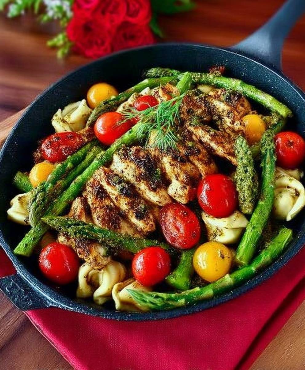 Spring and Summer DINNER: One-Pan Pesto Chicken, Tortellini, and Veggies, Asparagus, Tomatoes: Where Fresh Flavors Meet Ultimate Convenience