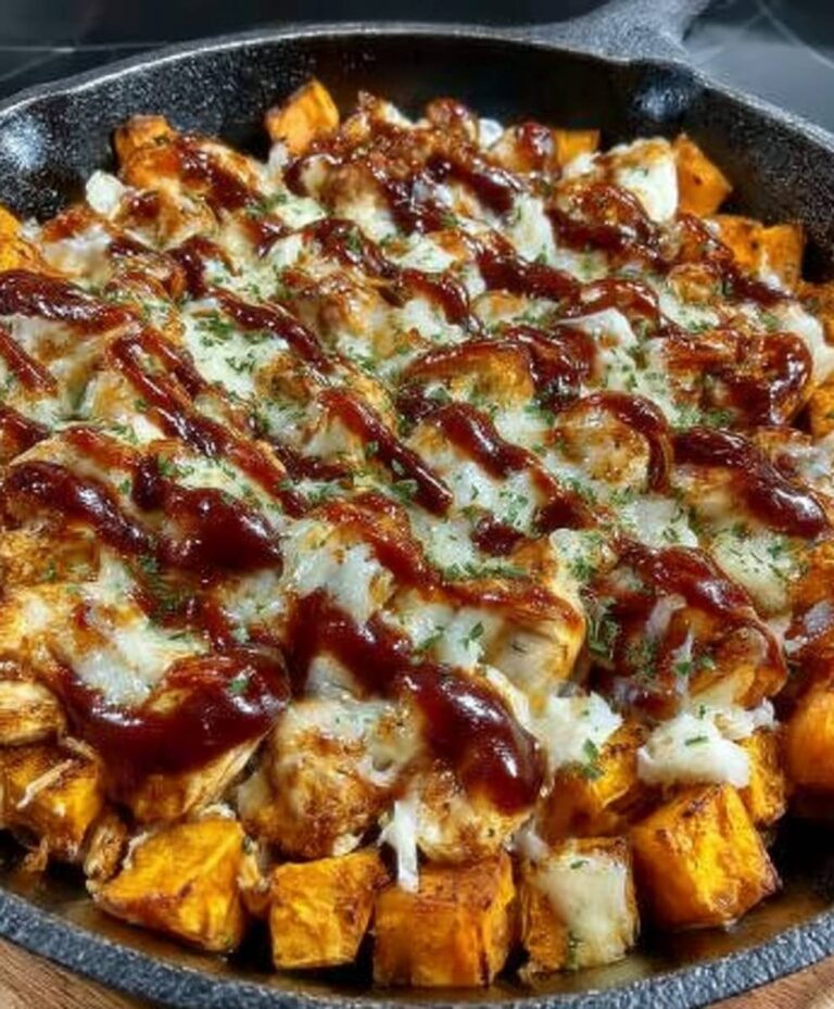 Experience comfort in a pan! Tender sweet potatoes, smoky BBQ chicken, and melted cheddar unite for an easy, flavorful family skillet. Recipe & nutrition data inside.