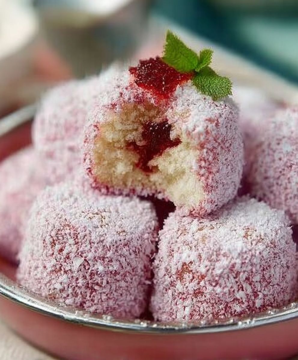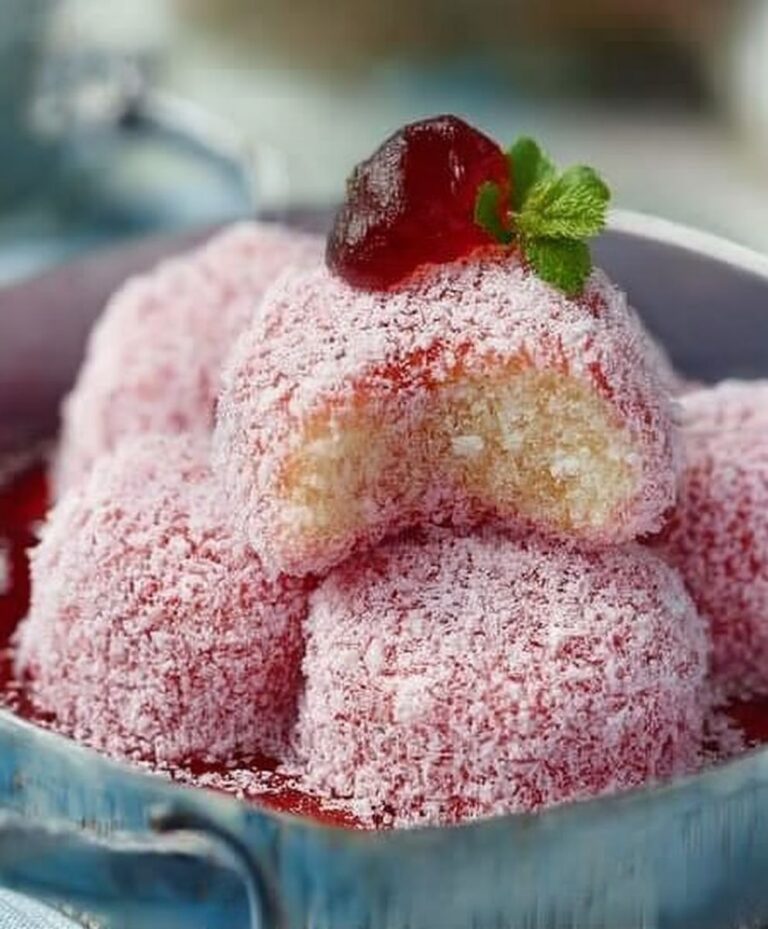 - Savor the whimsical contrast of soft, fluffy cake bathed in vibrant pink jelly, perfectly complemented by a generous, sweet coating of tropical shredded coconut.